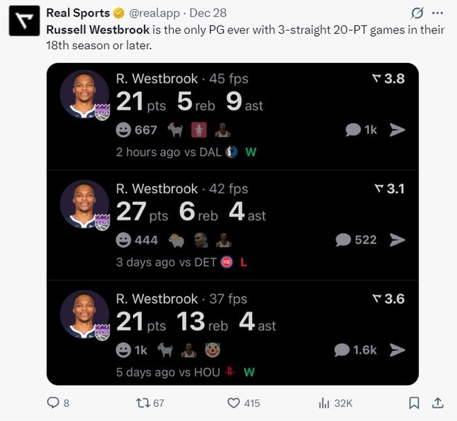 北京時(shí)間12月29日,國(guó)王以101-125不敵湖人。這場(chǎng)比賽拉塞爾-威斯布魯克的表現(xiàn)一言難盡,重返斯臺(tái)普斯本該是爆炸復(fù)仇的表現(xiàn),可他此役進(jìn)攻端多次被搶斷,上空籃還不中,面前4-5米沒(méi)人的三分也哐哐打鐵,少爺這場(chǎng)復(fù)仇之戰(zhàn)是一敗涂地,全場(chǎng)比賽17中6拿13分6失誤。
